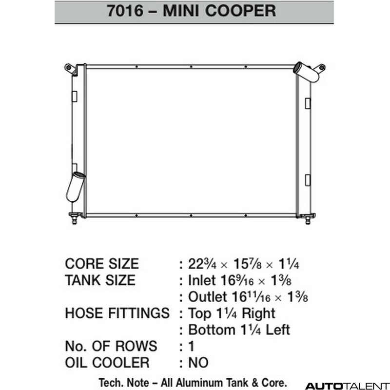 CSF Performance Radiator For Mini Cooper S 2002-2006Vendor: CSFDescription: CSF Radiator Increase the life of your vehicle's engine by keeping your cooling system in top condition. Replace your faulty engine cooling component with this highly efficient replacement product and be sure the heart of your vehicle is in good working order. CSF...