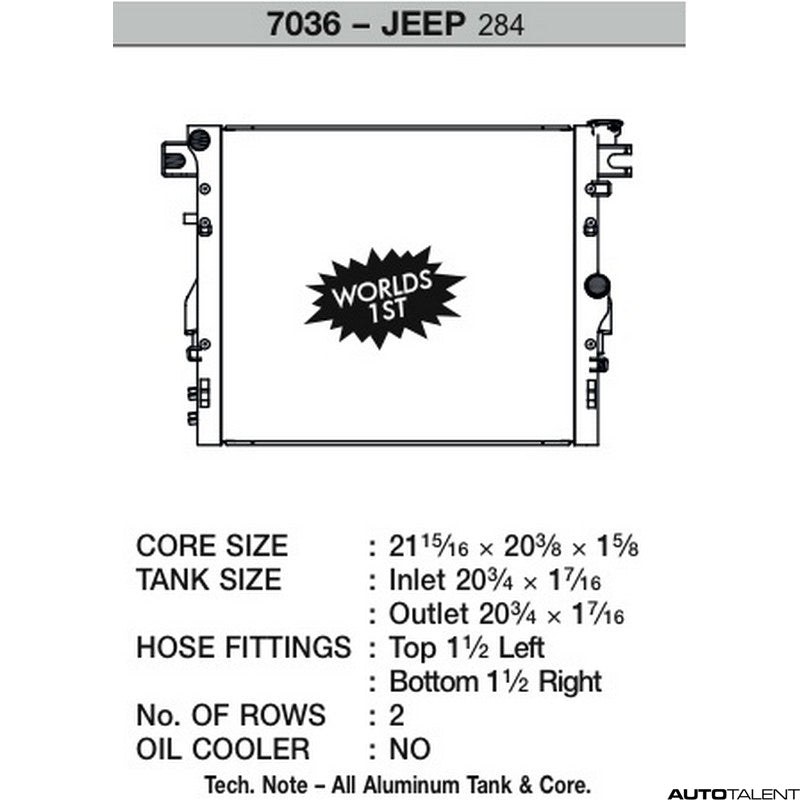 CSF Performance Radiator For Jeep Wrangler JK 2007-2015Vendor: CSFDescription: CSF Radiator Increase the life of your vehicle's engine by keeping your cooling system in top condition. Replace your faulty engine cooling component with this highly efficient replacement product and be sure the heart of your vehicle is in good working order. CSF...