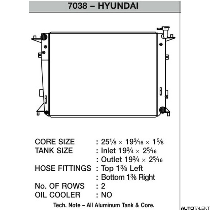 CSF Performance Radiator For Hyundai Genesis 2010-2012Vendor: CSFDescription: CSF Radiator Increase the life of your vehicle's engine by keeping your cooling system in top condition. Replace your faulty engine cooling component with this highly efficient replacement product and be sure the heart of your vehicle is in good working order. CSF...