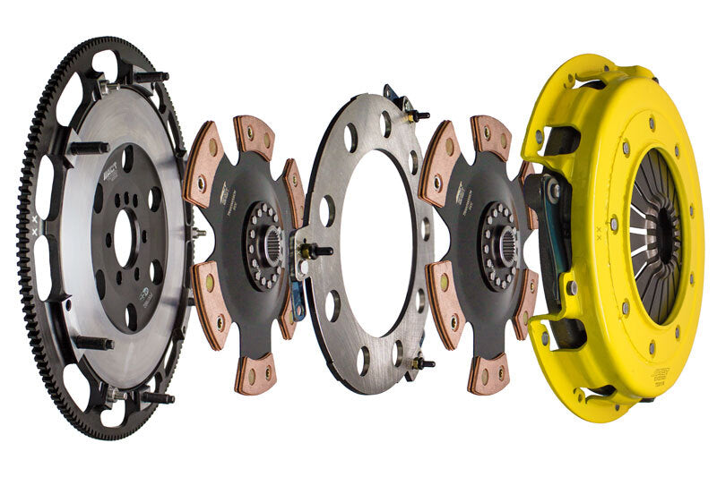 T1R-G02 twin disc kit offers twice the number of disc surfaces for better wear, heat capacity and long life compared to single disc kits. These kits use a proprietary Positive Lift Floater System design, which results in quiet operation with no floater rattle and no posts to wear. ACT twin disc kits endure an exclusive four-stage, heat treating process performed on all diaphragms. The ACT twin disc features the ability to adjust for disc wear and provides equal disengagement for discs. ACT's 6-pad rigid race discs are made with high quality, ceramic friction materials. The chrome-moly hub is heat-treated for strength and durability. The lightweight, rigid design allows for quicker shifts and trouble-free service. All ACT twin disc kits include a CNC-machined and dynamically balanced flywheel to ensure trouble-free installation and operation. ACT twin disc kits include a pressure plate, two discs, a floater, flywheel and alignment tool. Some kits may include a pilot bearing and release bearing.