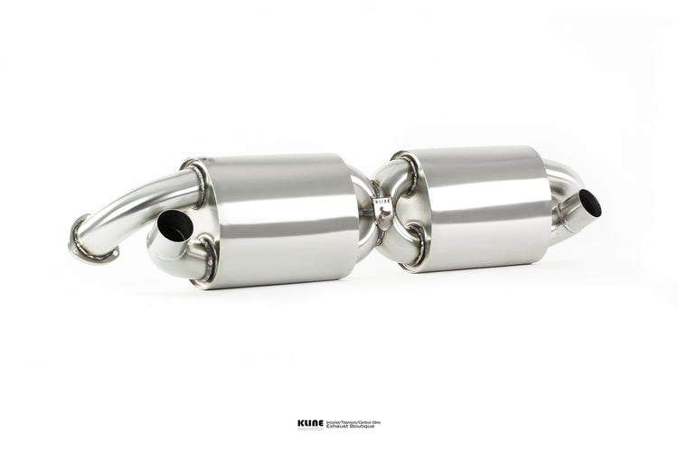 The Factory setup produces the most lackluster sound, mainly due to a series of chambers, 600 cell catalysts, and the most prominent flaw being the lack of balance between opposing banks. Seriously, i would recommend when considering any aftermarket exhaust for a Porsche turbo, never buy an exhaust without some kind of gas balance between left and right banks. replacing the stock cats for a choice of 100cpsi, 200cpsi, or de-cat increases the sound respectively. Replacing the chambered transverse rear silencer with freeflow harmonically tuned silencers enriches the sound, and the addition of our trademark 1D CLR laminar flow X pipe raises the exhaust pitch beyond the region in which bass noise is able to penetrate the cabin, while under hard throttle and high revs, a rich and raucious vocal ensues. This design was pioneered and innovated by Kline, however several copycat designs have started to appear.
