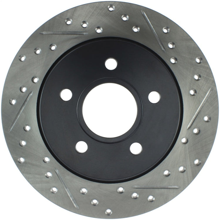 StopTech Drilled and Slotted Sport Rotors are 1-piece direct replacement brake discs for factory brake systems and stock calipers that look great behind your wheels – and offer significantly improved braking performance. The unique cross-drilling and slotting aids with heat and brake dust dispersal; prevents glazing of the pads; adds bite and improves wet and dry braking performance. Built to last; the black e-coating provides protection from corrosion and the high carbon metallurgy (in most applications) offers quieter operation; better crack resistance and increased performance.