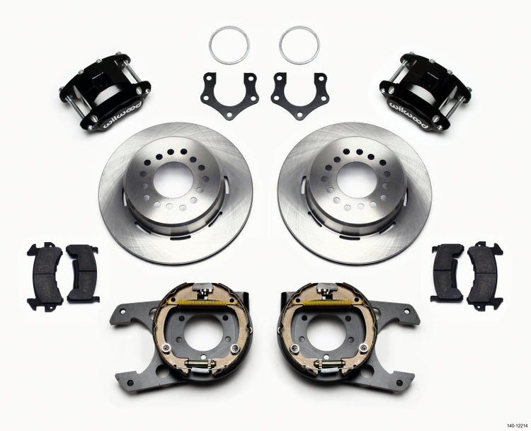 D154 Pro-Series rear disc kits provides a complete solution for popular muscle car rear axles that require a parking brake. Forged D154 dual piston calipers, 12.19” one-piece drum/rotors, and high friction pads provide optimized and balanced braking for all types of custom performance street/strip and show machines. The neatly hidden internal shoe system provides a clean installation with superior static holding power for parking. D154 rear caliper kits offer a complimentary match to vehicles using Wilwood D52 or D154 calipers on OE spindles. Optional caliper finishes and rotor designs enable the builder to personalize the style and optimize brake performance.
