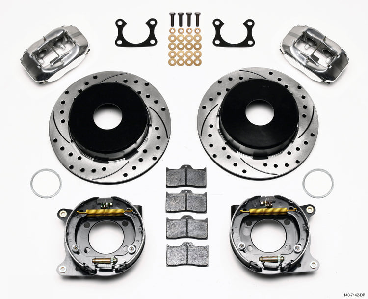 This group of FDL Pro-Series rear disc kits provides a complete solution for popular muscle car rear axles that require a parking brake. Forged billet Dynalite four piston calipers, 12.19” one-piece drum/rotors, and high friction pads provide optimized and balanced braking for all types of custom performance street/strip and show machines. The neatly hidden internal shoe system provides a clean installation with superior static holding power for parking. Optional caliper finishes and rotor designs enable the builder to personalize the style and optimize brake performance for every individual application.