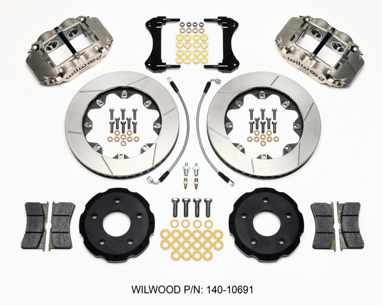 This kit is configured for dedicated road racing on 1998-02 Camaros and Firebirds, or any 1993-97 model that has been upgraded with the 1998-02 spindles. Four piston, nickel finish Quick-Silver FSL4R/ST calipers, with Thermlock® pistons and internal knock-back damping springs, are volume matched for system compatibility with either the factory power brake booster and master cylinder, or a manual balance bar style pedal with appropriately sized master cylinders. The kit includes two-piece 12.19” diameter Spec 37 alloy GT series directional vane rotors to comply with SCCA American Sedan rules, cross-overs into the NASA pony car categories, or any other sanction racing with 16” or 17” wheels. Unsprung and rotating weight are minimized by mounting the rotors to the OE hubs with forged aluminum hats. Each kit includes high-temp Wilwood race compound pads, machined billet radial mount caliper brackets, stainless steel braided flexlines, and all premium grade hardware.